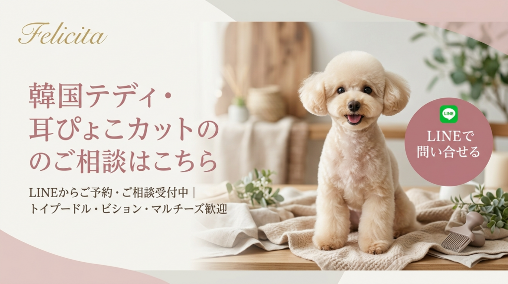 耳ぴょこ、韓国テディ、まんまるテディといった言葉からもわかるように、ただ短く整えるのではなく、その子の魅力がいちばん伝わる形に寄せていく提案型のトリミングが、このアカウントの魅力です。Felicita全体としても、韓国テディカット発祥を掲げ、トイプードルやビションフリーゼなどのスタイル提案で紹介されており、方向性の一貫性が感じられます。